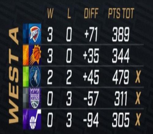 西部A组:雷霆太阳都是3胜0负,最后1场正面交手决出第1第2,第1晋级,第2将是3胜1负,与其他组第2比战绩。森林狼、国王、爵士出局。