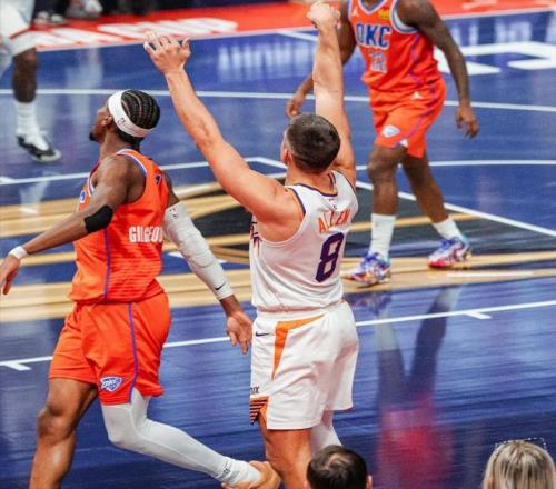 西部NBA杯1/4决赛首场比赛正式开打,太阳队这边布克、杰伦格林两大核心依旧无法出战,狄龙、奥尼尔、威廉姆斯、吉莱斯皮、阿伦先发,雷霆这边哈滕、乔不打多特、杰伦·威廉姆斯、霍姆格伦、华莱士、亚历山大先发迎战!赛前ESPN给出雷霆胜率达到了88.9%说明这场对决普遍认为太阳机会渺茫,现阶段雷霆正处于23胜1负开局的良好状态,15连胜风头无两,场均得分123.0分(联盟第2),场均失分106.9分(联盟第1),攻防效率全部都在联盟前列是一支史诗级强队,此役卡鲁索、多特两大顶级3D复出,亚历山大休战一场后也重新回到场上,从阵容结构来看就足以证明雷霆对于本场比赛的重视程度。太阳这边目前总战绩14胜10负排名西部第7,过去5场输掉了其中的3场,平心而论太阳能打出如此战绩已经超过了许多球迷预期!