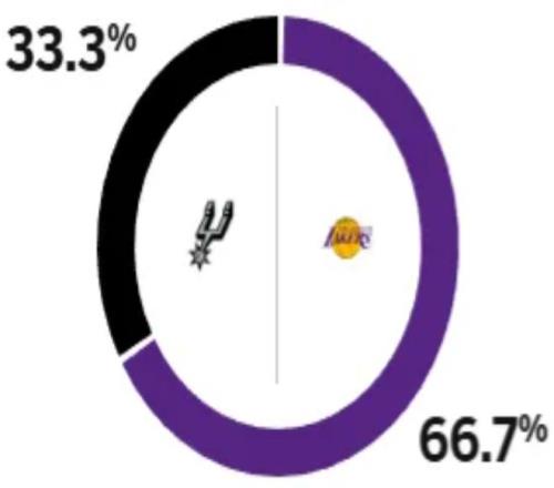 赛前,美媒ESPN对本场比赛进行了胜率预测:湖人队胜率高达66.7%,马刺队胜率则仅有33.3%,劣势明显。