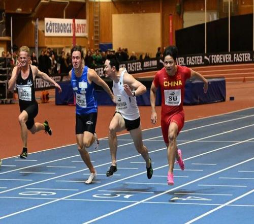 2023年2月2日,苏炳添(右一)在世界田联室内巡回赛男子60米A组决赛中。新华社发