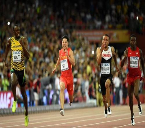 2015年8月23日,苏炳添(左二)与博尔特(左一)在世界田径锦标赛男子100米半决赛中。苏炳添以9秒99的成绩晋级决赛。新华社记者 李钢 摄