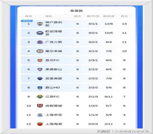 神户胜利船以13分高居榜首,主场战胜申花之后,广岛三箭积分来到11分,跻身三甲行列。