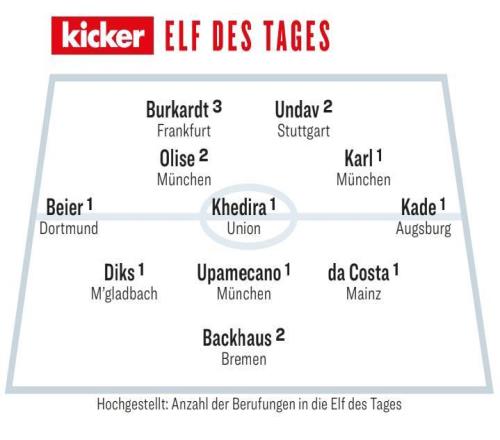 踢球者评德甲第11轮最佳阵容:卡尔、奥利塞、于帕、拜尔入选